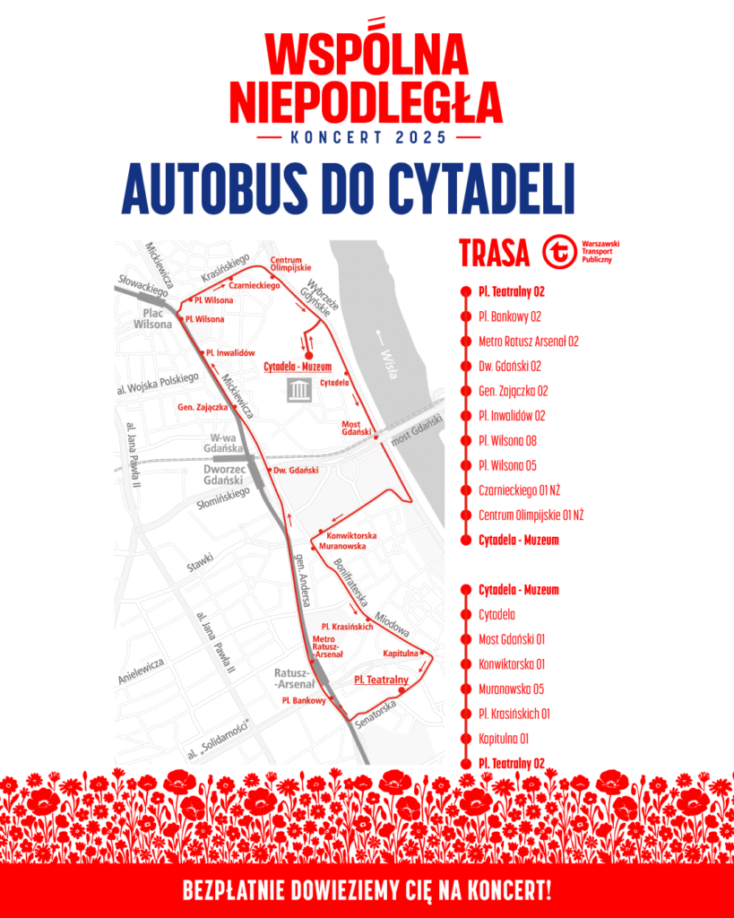 Na koncert „Wspólna Niepodległa 2025” będzie można wygodnie dojechać specjalną, darmową linią autobusową „WN”, kursującą między Teatrem Wielkim a parkingiem autobusowym na Cytadeli. Na Cytadelę można dotrzeć także autobusami linii 185 lub dojść pieszo z placu Wilsona.